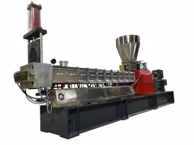 在加熱和混合的作用下,材料在擠出腔內形成高壓狀態,并通過模具的作用,將材料擠出成型,形成顆粒產品。主要組成部分包括驅動系統、傳動系統、加料系統、加熱冷卻系統、真空排氣系統、切粒系統等。
